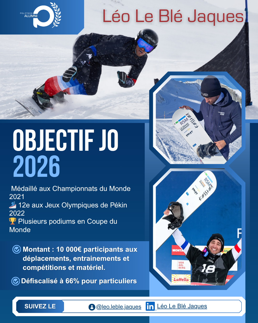 Pour concrétiser son rêve, Léo recherche aujourd’hui le soutien des alumni et amis de Polytech. Il lui manque encore 10 000 € pour compléter son budget 2025-2026, indispensable à sa préparation (entraînements, compétitions, déplacements, matériel).