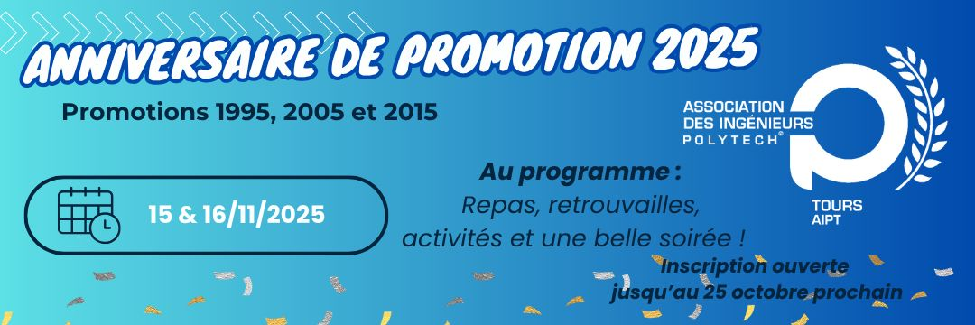 Il rassemblera les Anciens de Polytech Tours et de ses écoles fondatrices (CESA, E3I, EIT) issus des promos en 05.