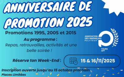 Anniversaire des Promotions en 5 de Polytech Tours🎓 Chères diplômées et chers diplômés, C'est avec plaisir que nous t'annonçons notre premier Week-end Anniversaire de Promotion. Il rassemblera les Anciens de Polytech Tours et de...
